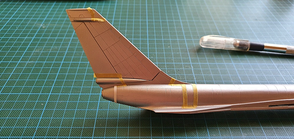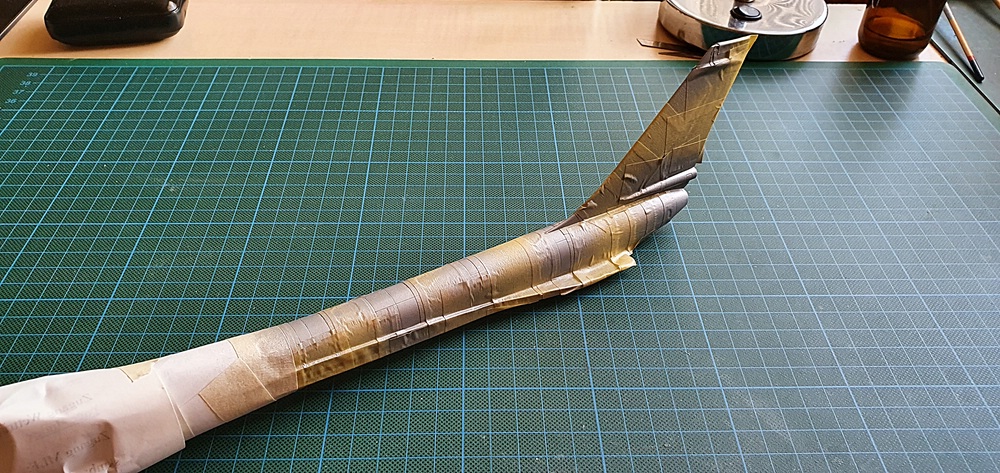 Dann habe ich schon mal alles zum abkleben, des Rumpfes vorbereitet und mit einer kleinen Ecke, oben am Leitwerk angefangen.