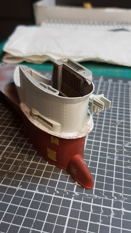 Die ersten Teile der Ausrüstung haben auch ihren Platz gefunden: Turmluk, Frontverkleidung mit den Steuerelementen sowie eine Abdeckung. Die Sehrohre und UZO kommen erst nach dem Lackieren der Außenseite. So kann ich das Innere der Brücke noch mit einem Stück Schaumstoff abdecken