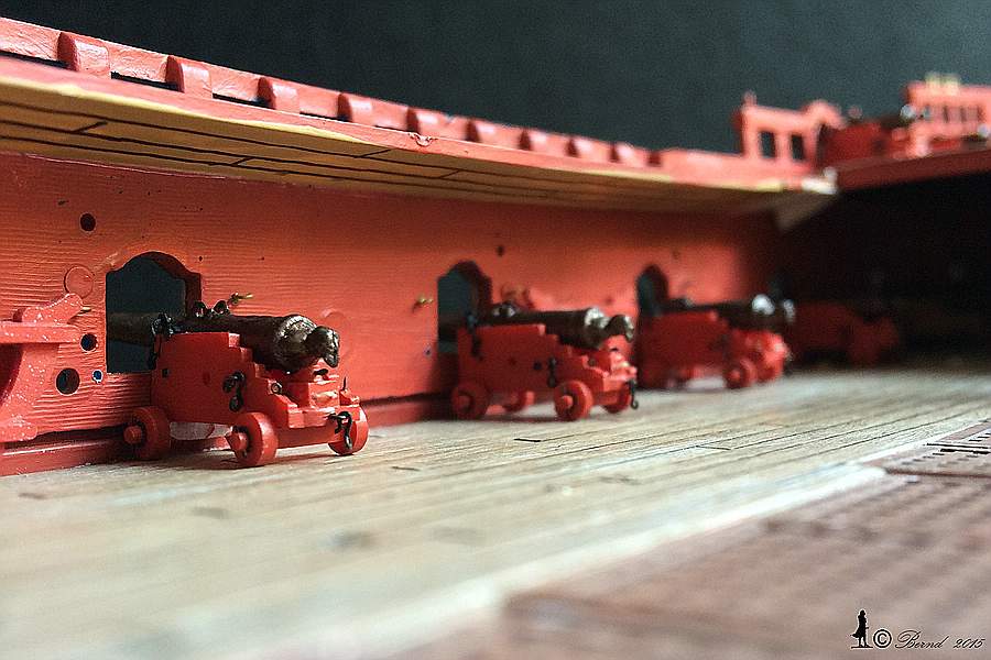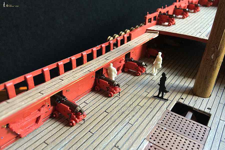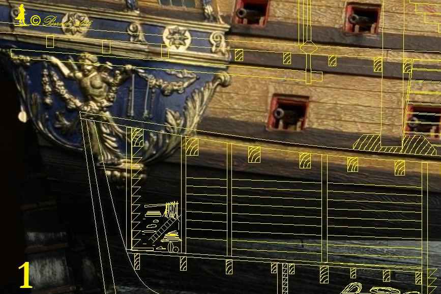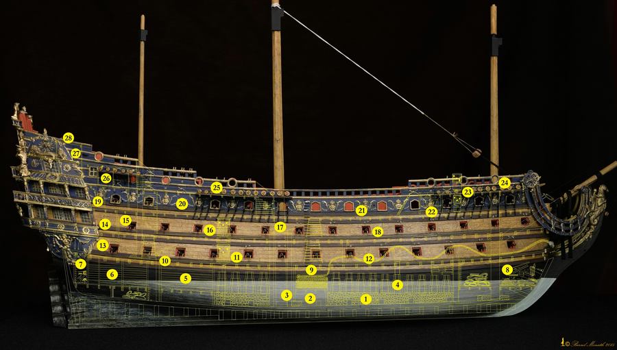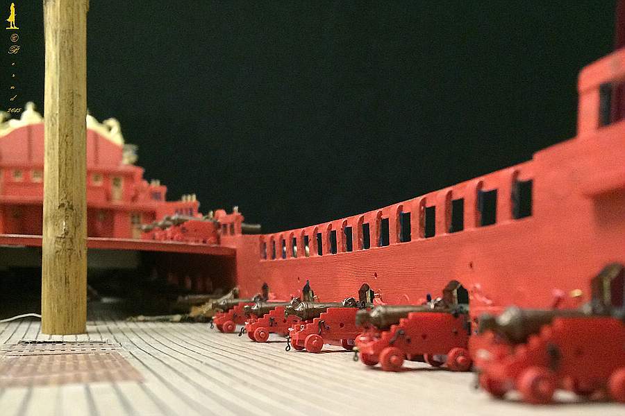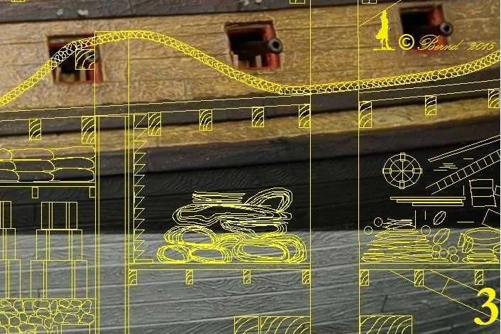 Wirft man einen Blick in das Album von Colbert, dann ist bei dem dortigen Referenzschiff der Monarque mit 84 Kanonen der Mast in der Tat auf dem mitttleren Deck gegründet. Bei dem Längsschnitt der Louis XV von Edmond Paris aber in der Tat auf dem untersten Deck fixiert. Jetzt waren die Kubaturen von der Monarque und der Louis XV nicht soooo unterschiedlich, aber immerhin, kann sein dass ob der größeren Royal der Mast weiter unten eingebunden wurde, um die Hebelarme zu verlängern und damit das Kräftepaar in Decksebene zu minimieren. Andererseits sind die Infos von Edmond Paris auch nicht gerade der Weisheit letzter Schluss. Aber daran erkennst du, dass mir als Risszeichnung der Längsschnitt von Paris gedient hat.