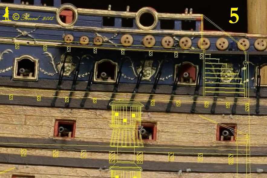 Ich denke da an einfache Rundstäbe aus Eisen mit Öse und einfachem eingeflochtenem Tau, (wie zum Beispiel die Sicherung am Bugspriet). Ich muss allerdings noch recherchieren, ob das Geländer wirklich vorhanden war und in welcher Ausführung. Ich bin mir aber sehr sicher, dass dort eine Absturzsicherung eingebaut wurde.