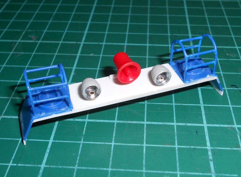 Nachdem ich die Anschlußleitungen der Martinshörner geändert habe und auch die Astabweiser angebracht habe, war das ganze so instabil, das die Verstrebungen gebrochen sind. Nachdem ich mich damit bereits ein paar Stunden herum geärgert habe, ich kann die Teile ja kaum Sehen, habe ich mal kräftig zugedrückt und das ist dabei raus gekommen.