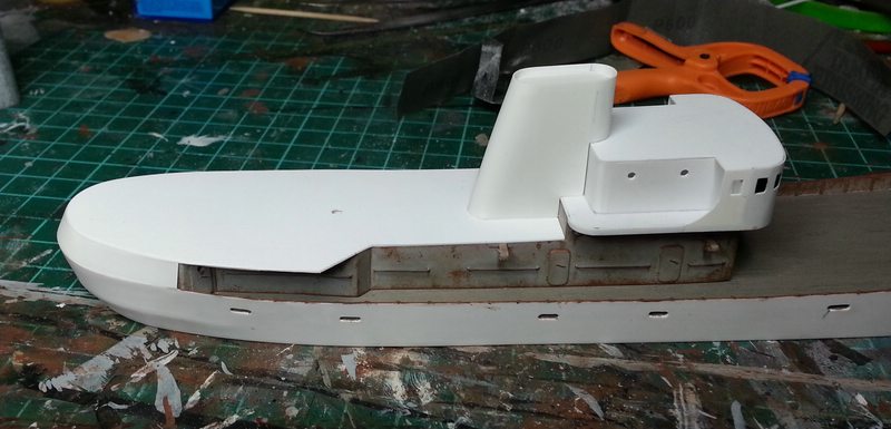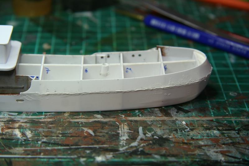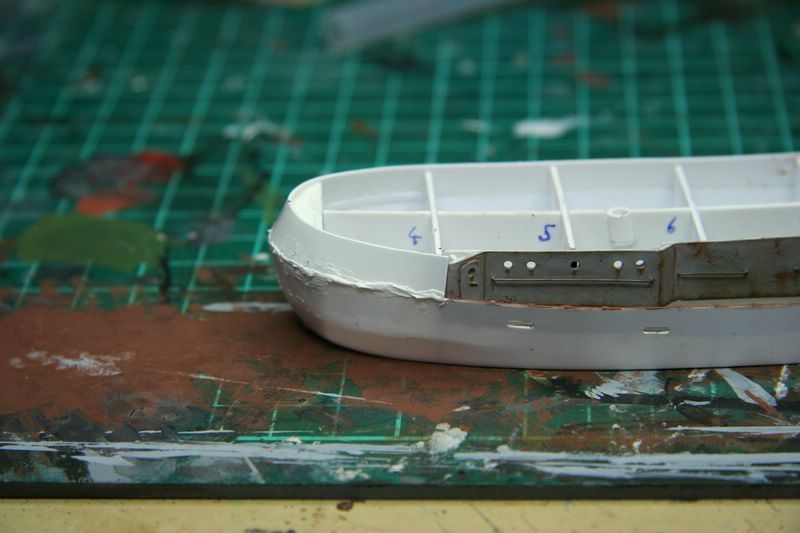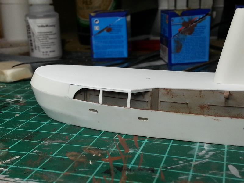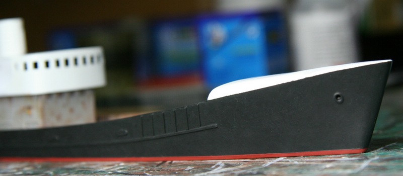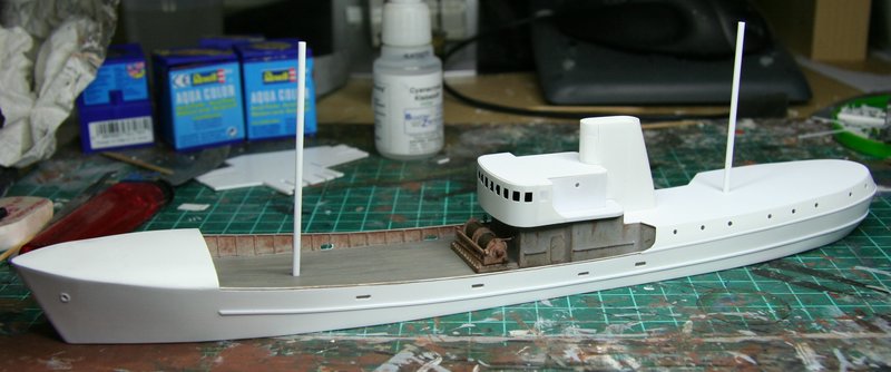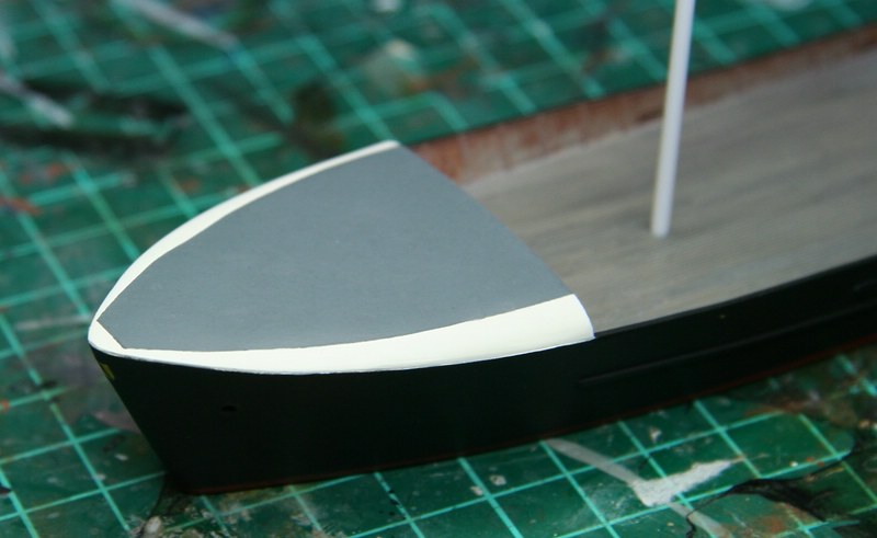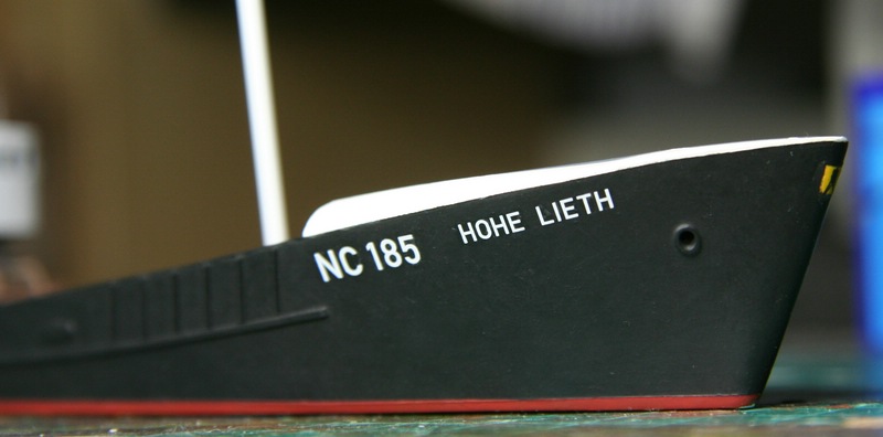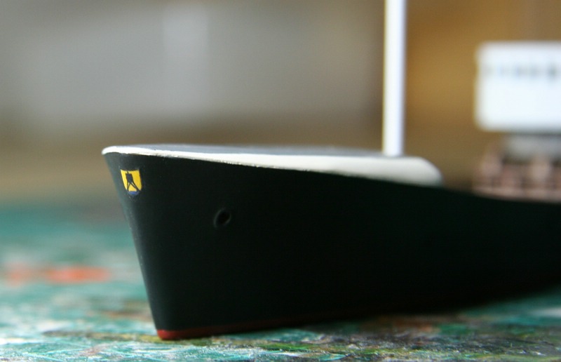 Am Heck sind die Decals auch schon mit Mattlack versiegelt, am Bug muss ich das noch machen. Ach ja und dann fehlen noch Tiefgangsmarken...