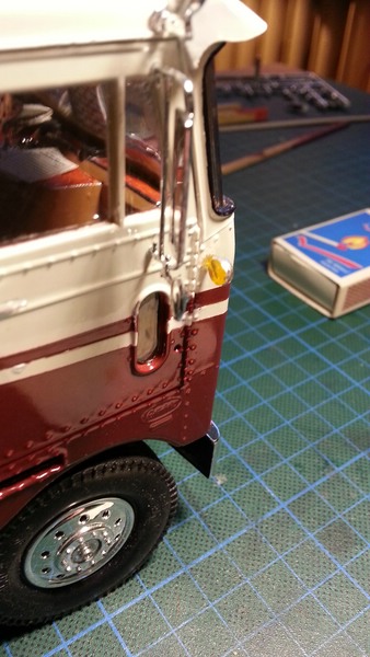 Nachdem das aber auch geschafft war, war die Frage, wofür sind diese beiden Löcher da eigentlich? Oben auf dem Bild ist eines davon rechts neben der kleinen Seitenscheibe noch zusehen. Nun mal die Bauanleitung konsultiert und siehe da, da soll ja noch ein Spiegel hin.Benutzerinformationen überspringen