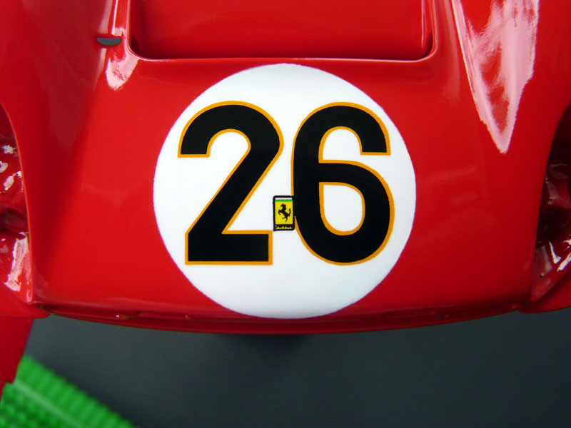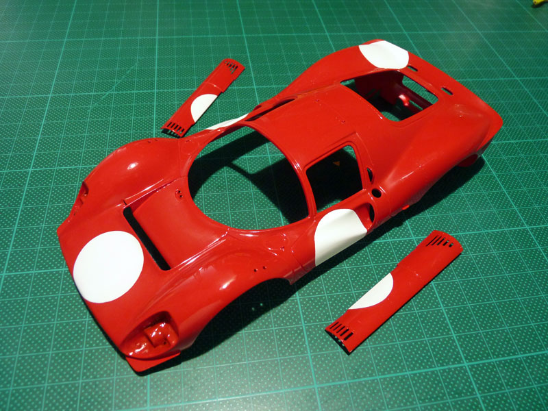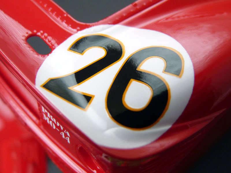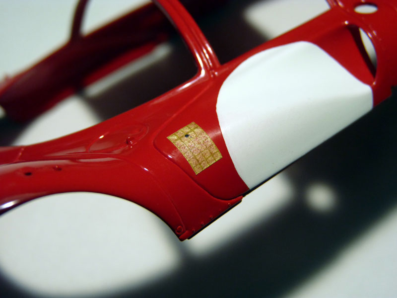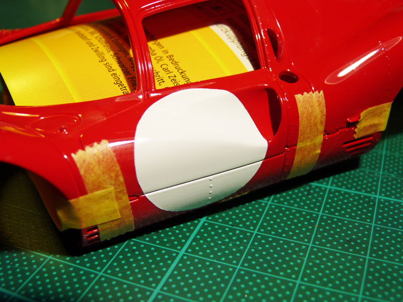 Des Weiteren habe ich festgestellt, dass die weißen Nachschiebebilder mit den Startnummern äußerst dünn sind. Was zur Folge hat, dass die weiße Farbe eher rosa wird als weiß bleibt. Dies ist mir aufgefallen, als ich auf einer englischen Webseite das fertige Modell mit den Startnummern gesehen habe. Um das Problem zu umgehen, wird meine Lösung sein, die weißen Flächen mit der Airbrush aufzutragen. Dies wird wiederum eine Klarlackschicht erforderlich machen. Es werden also mehrere Farbschichten nötig sein. Was das Erhalten der Details, wie zum Beispiel bei den Nieten, erschweren wird.