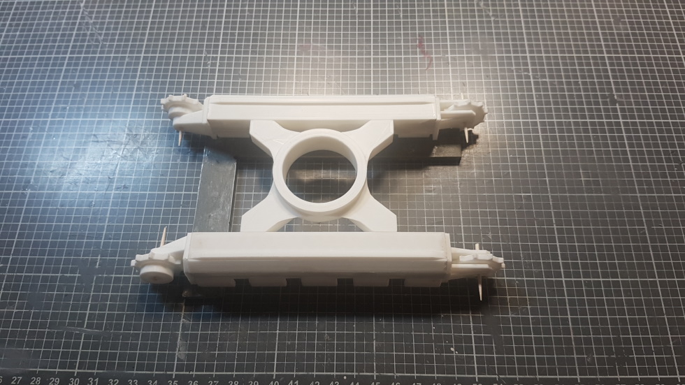 Hier das gesamte Fahrwerk (heißt das bei einem Auflieger überhaupt so?) Die lose eingesetzte Fahrwerkshalterung ist noch das Bausatzteil: