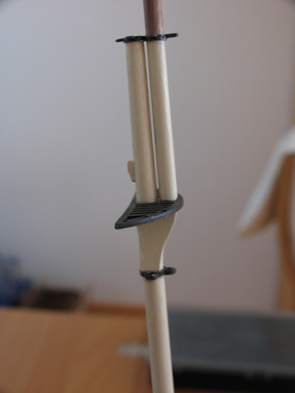 3. Flaschenzüge und Klampböcke (schreibt man das so?): Artesania Latina hat einen feinen Draht beigelegt um diese an Masten usw. zu befestigen. Das klappt nicht. Zu oft kommt es vor, daß dieser dünne Draht durch die Ösen rutscht. Außerdem bleiben die Teile damit unflexibel und besonders hübsch ist es auch nicht. Ich bin inzwischen dazu übergegangen statt dem Draht 0,15 mm schwarzen Garn zu verwenden. Bitte darüber nachdenken, ob diese Idee nicht vielleicht doch überlegenswert ist.