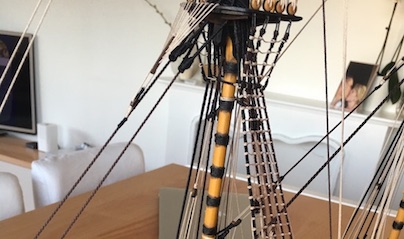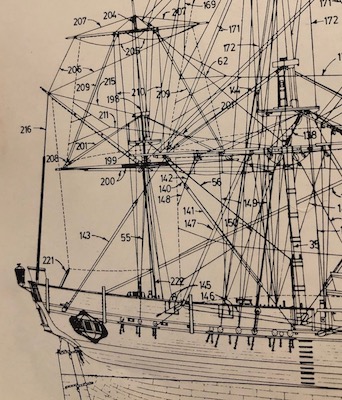 Das einzige, was mir aufgefallen ist: Der Gaffelbaum des Besansegels sitzt oberhalb der Bagienrah des Kreuzmarssegels. Meine Erachtens müsste er jedoch darunter ansetzen mit seiner Gabel im vorgeholten Zustand, sonst könnte er nicht in Richtung Deck abgefiert werden, da dabei das Tauschlingenrack der Bagienrah in die Quere kommen würde. Oder liege ich da falsch? Sieht der Bausatz das so vor?