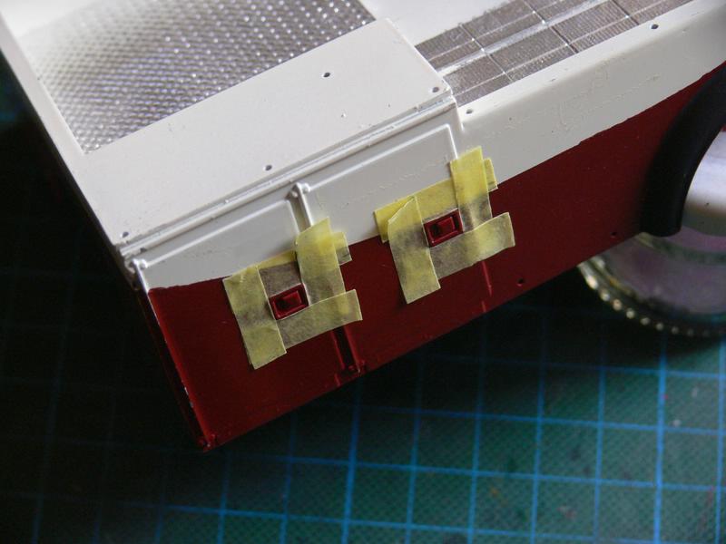 Ein paar Kleinigkeiten waren nun noch zu machen, zu nächst einmal, die seitlichen Beleuchtungen, aus dem Revellbausatz, die mir so noch nicht ganz gefallen wollten. Ich habe diese Teile erst einmal mit klar Orange lackiert und anschließen kamen mehrere Schichten Holzleim darüber, bis sich eine Haube gebildet hatte. Dann noch mal mit klar Orange lackiert und zum Schluss noch eine Schicht Klarlack.