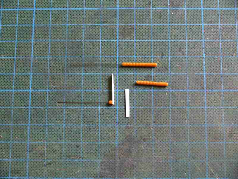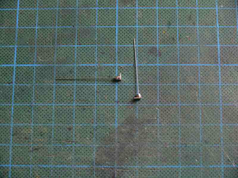 Nun habe ich mir aus 0,5mm Messingdraht, zwölf 6mm lange Stücke abgezwickt, die wurden in Wäscheklammern eingespannt und das eine Ende mehrmals in Holzleim getaucht.