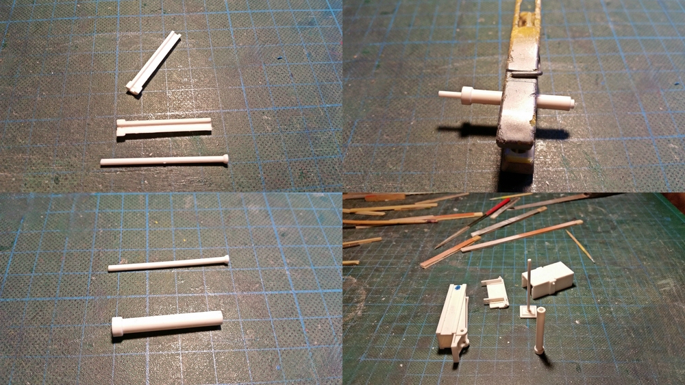 Dazu hier zwei Teile, die später am Heck angebracht werden, diese wurden gespachtelt und geschliffen, dann angeklebt. Unten kamen dann noch bewegliche Ösen dazu, die mit zwei weiteren Teilen befestigt wurden.