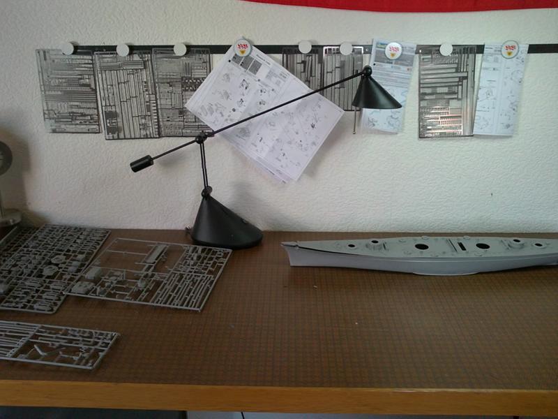 . Ich hab die Gitter für die Lüfterschächte am Turm Bruno und Cäsar und die Blenden für die Oberlichter an Bug und Heck angebracht.
