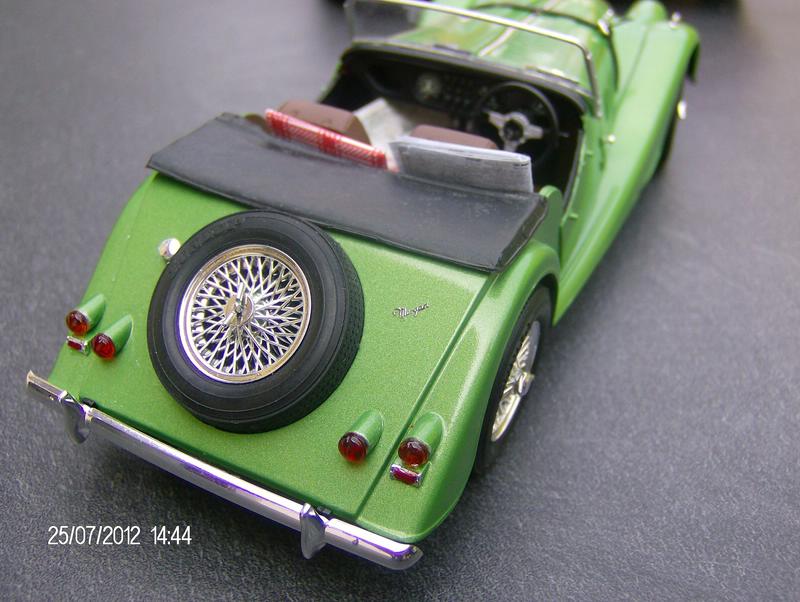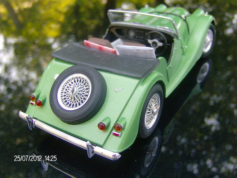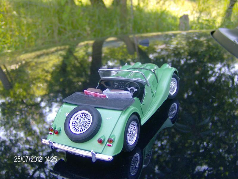 heute möchte ich euch endlich mal wieder etwas zeigen von mir. Wie viele wissen, habe ich einen England-Tick (auch grade passend zu der Olympia-Eröffnung in London), genau deswegen habe ich den Morgan bereits gebaut gekauft. Auch wenn ich zu großen Teilen nichts an dem Morgan verändert habe, möchte ich ihn euch trotzdem vorstellen. Den Lack habe ich so gelassen, mir gefällt die Farbe, und da kann ich drüber hinwegsehen, dass sie trotz Politur nicht besonders glänzt. Ist halt ein alter Engländer. Die einzigen Überarbeitungen an dem Morgan bezogen sich auf die Reparaturen der Achsen und auf die Überarbeitung des Innenraums.