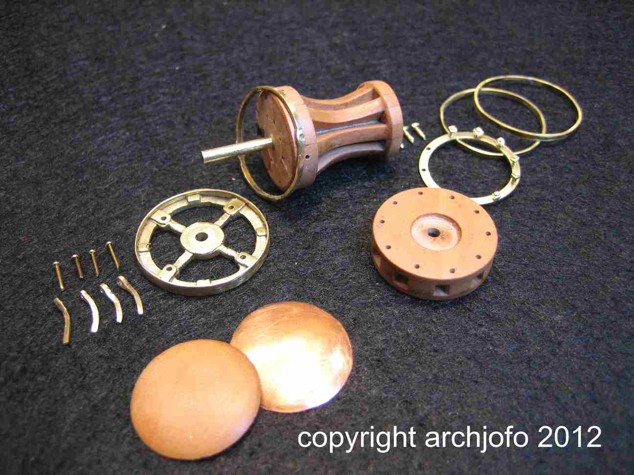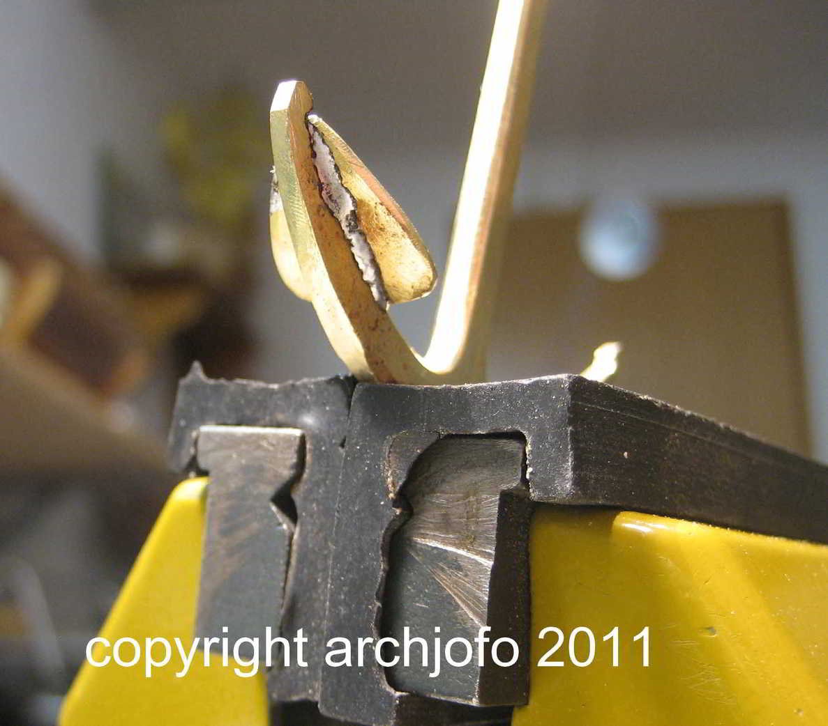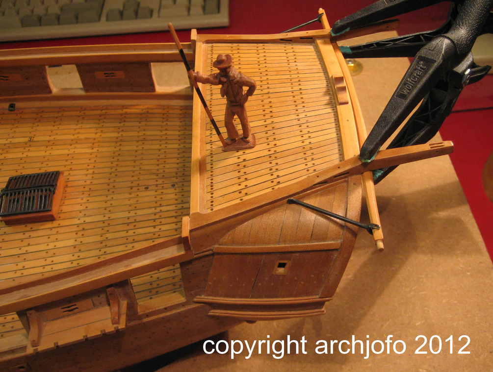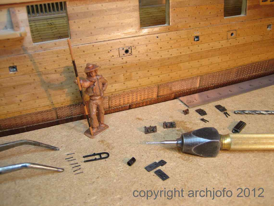 Die Befestigung der Beschläge für die Belichtungs- und Belüftungspforten (keine Riemenpforten, wie ursprünglich angenommen), die das Unterdeck mit spärlichem Licht versorgen und beim Öffnen eine geringe Querlüftung ermöglichen, erfolgt mit kleinen Bolzen. Diese haben einen Schaft mit 0,3 mm Durchmesser, wobei der Kopfdurchmesser der Bolzen bzw. Nieten 0,5mm beträgt. Dazu müssen noch 8 Bohrungen mit einem Durchmesser von 0,3 mm in diese Beschläge gebohrt werden. Das ist eine sehr diffizile Angelegenheit, da die Materialbreiten der Beschläge unter einem Millimeter liegen.