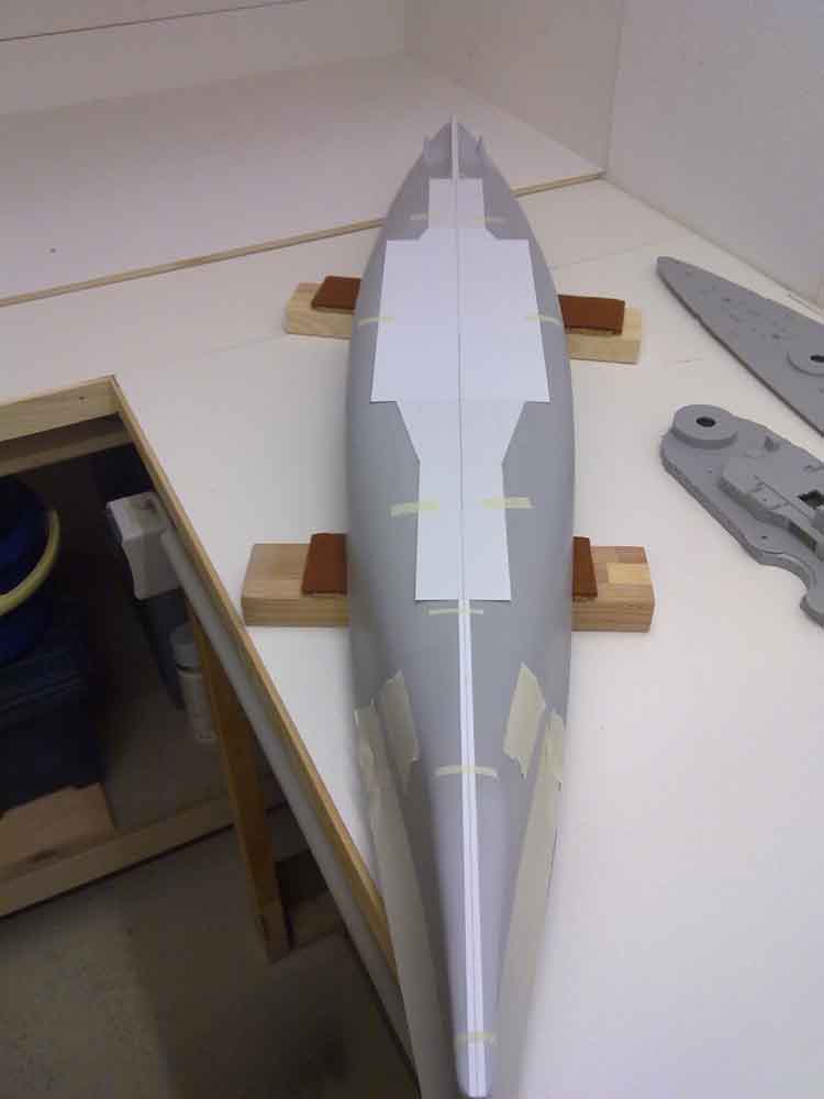 Den fertigen Rumpf kopfüber auf eine plane Unterlage stellen (z. B. eine Melaminharzbeschichtete Spanplatte sprich Regalboden) und geeignet unterelgen, so dass der Kiel exakt horizontal verläuft.