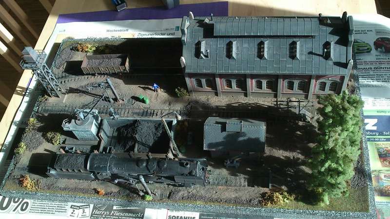 hier ist ein Beispiel für meine Ausflüchte in die Modellbahnwelt. Ich hatte in meinen Schränken noch einen Bausatz einer Baureihe 01 von Revell gefunden. Und als ich angefangen habe dieses Modell zu bauen, kam mir die Idee.... Bau mal ein Diorama. Zum Glück hatte "Feinkost-Albrecht" einige Faller Gebäude im Angebot. Und dann kam eins zum anderen. Mein Vater wusste nicht wie er sein Bahnbetriebswerk auf seiner Modellbahnplatte gestalten sollte und da habe ich ihm zum Geburtstag dieses Anschauungsbeispiel geschenkt (Es steht mittlerweile unter einem Glasdeckel) Daraufhin haben wir sein Bahnbetriebswerk gemeinsam gestaltet und ich durfte die Gestaltung der Landschaft und Gebäude übernehmen.