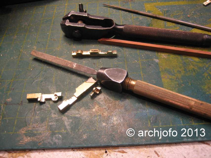 Einige Metallplatten, so z. B. die Spindelauflagen sind nicht nur aufgesetzt, sondern werden wie beim Original in das Holz eingelassen. Das ist zwar etwas mühsam, jedoch spricht das Ergebnis für sich. Diese Messingbeschläge, im Original aus Eisen, werden später mit Microbolzen (0,3 mm Schaftdurchmesser, 0,45 mm Kopfdurchmesser und 2 mm Länge) befestigt. Diese kann ich natürlich selbst nicht anfertigen, und sind daher zugekauft. Wogegen die Bolzen mit 4-Kantmuttern und 4-Kantköpfen (0,6 mm Schaftdurchmesser, 0.8 mm Kopfbreite) aus eigener Fertigung stammen. Die Herstellungsmethode hierzu habe ich bereits ziemlich am Anfang meines Bauberichtes näher beschrieben.