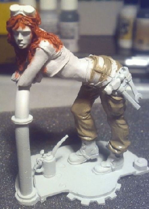 Kein vergleich zu Kunststofffiguren! Hihi ja und da schaut ein Slip unter ihrer Hose hervor... Das mit dem erst spachteln und bemalen und dann kleben klappt bei Weißmetall glaube ich nicht sehr gut. Auf Kunststoff hält alles sicher viel besser aber bei Metall ist das ein andere Geschichte.