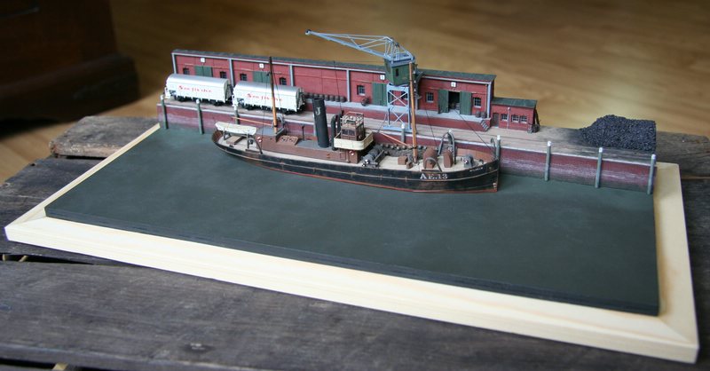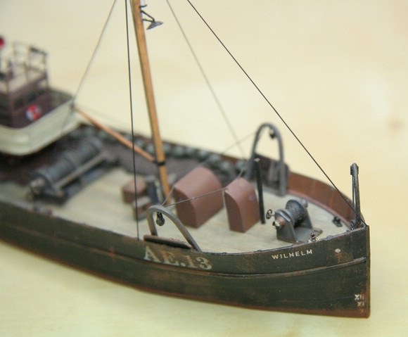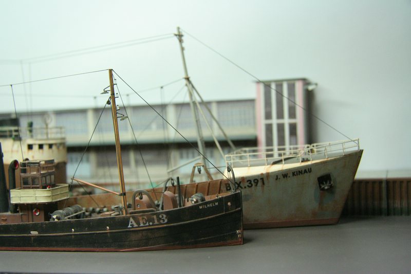 Ich wollte mich nicht auf ein konkretes Vorbild festlegen, sondern vielmehr einen typischen Fischdampfer um 1920 bauen. Ein zweites, aber etwas größeres Modell eines ähnlichen Fischdampfers dieser Zeit soll demnächst folgen und dann mit der "Wilhelm" im Päckchen im oben gezeigten (noch nicht fertigen) Fischereihafen-Diorama liegen...