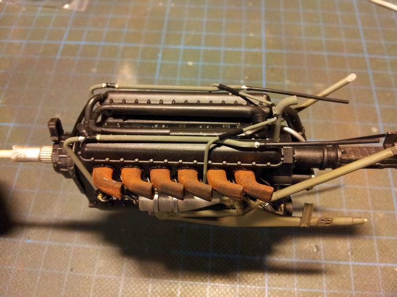 Da ich beim Motor etwas Pausiere um Recherchen zu betreiben, habe ich mich zwischenzeitlich dem Cockpit gewitmet. Lackiert wurde mit Vallejo RLM66, danach gabs ein wash von AK Interaktiv, sowie eine Trockenbemalung mit Humbrol Sandfarbe. Die Spritleitung (gelb) wurde auch angebracht. Die Elektrokabel habe ich aus 0.3mm Kupferdraht hergestellt.