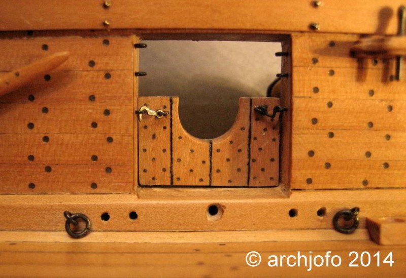 Auf Fotos einem Originalmodells der Le Suffren aus dem Musée de la Marine in Paris ist mir ein wichtiges Detail zur Befestigung der Stückpfortendeckel aufgefallen. Auf einer Detailaufnahme ist die Hakenform sehr konkret abgebildet. Diese Form entspricht dem Haken eines Halbdeckels der La Créole, der auf dem bekannten Bild von Horace Vernet zur Schlacht von San Juan de Ulúa bei sehr genauem Hinsehen schwach zu erkennen ist.