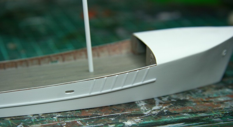 Nachdem 90% der Spachtelmasse wieder abgetragen wurden und ich die die Rumpfverkleidung in der Höhe den Spanten angepasst hatte (Foto fehlt), hab ich mich dem Bootsdeck gewidmet.