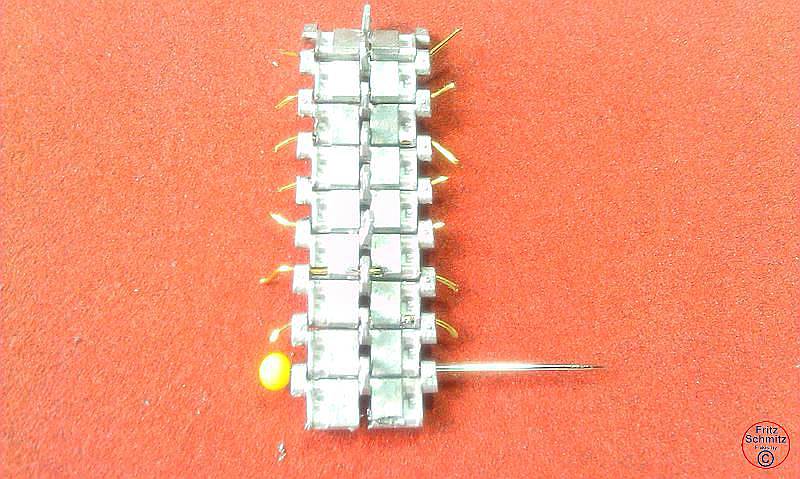Schönes Teil! Aber -- Jedes der etwa 180 Kettenglieder muss mit einem 0.5 mm Bohrer aufgebohrt werden. Dann sollten die Ketten-Glieder etwas gefeilt werden, damit sie nicht beim Zusammenbau klemmen. Danach werden die Drahtstücke so bemessen, dass sie etwa 3 mm an den Enden überstehen. Die Drahtenden werden dann später mit Gel-Sekundenkleber (kein Super-Flüssiger Kleber, damit der Kleber nicht die Gelenke verklebt!) fixiert. Man kann auch die Löcher der Enden, wenn man den Draht gekappt hat, mit Sicherungslack fixieren.