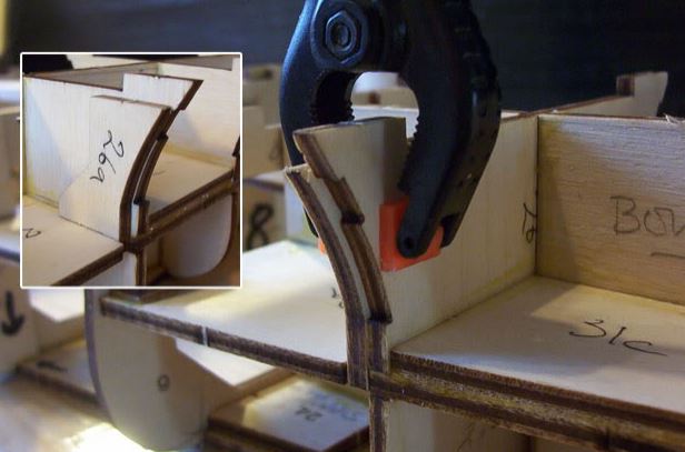 Heute sind die Spanten 26 bis 29 positioniert und eingeleimt worden, nichts aussergewöhnliches, aber es ist darauf zu achten das die Spanten winklig eingeklebt werden.....