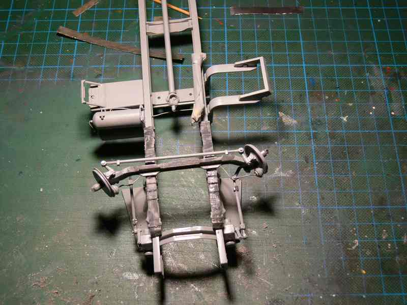Ausgerichtet habe ich sie natürlich am späteren Aufbau, zuerst mit der vorderen Hinterachse, diese wurde locker fixiert und nachdem sie angetrocknet war wurde alles umgedreht, dann kamen die Vorderräder und zum Schluss wurden die Räder der letzten Achse angebracht.