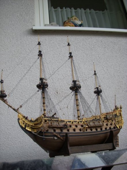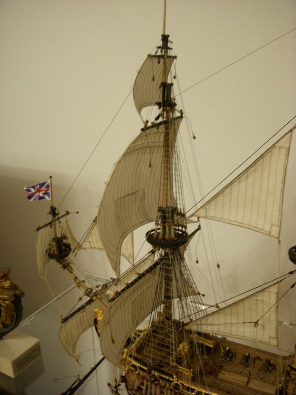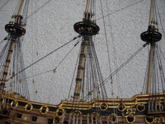 . Da ich die Segel ja mit Leim-Wasser-Haarspray behandel sind die dann recht steif und durch Luftfeuchtigkeit verziehen sie sich auch noch etwas sodass der Stag unweigelrlich auch verzieht. Nachvollziehen kann ich das die Stage durch Zug von Winddruck auf das Rigg geknickt und verzogen waren, allerdings hab ich das in Natura noch nie so gesehen wie es bei manchen Modellen zu sehen ist, da werden die Stage oft um einen cm und mehr aus der Linie gebracht und nach oben und nach unten gezogen. Diesen starken Verzug möchte ich immer vermeiden, ich hoffe ich bekomm das diesmal auch wieder hin. Mir geht es einfach darum das die Linie der Stage stimmig und natürlich aussieht. Bei einem Modell im Museum Maritim in Barcelona hängen die Stage auch etwas durch, das Modell ist aber ca. 3m lang und die Stage entsprechend dick uns schwer, auch dort sieht man keinen Knick im Stag, bei der Mini-Prince kann ich das Durchhängen nicht umsetzen, im Gegenteil, da muss ich den Stag schon richtig anknallen damit dann durch "Querkräfte" die Linie soweit bleibt....