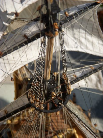 . Dann ist mir wieder ein Fehler unterlaufen: Ich hab das Rah des Bugsprits dort plaziert wo der Fockstag den Bugsprit erreicht, so ist es auch beim Londoner Modell. Aus optischen Gründen (Knick zwischen Fockstag und Grossstengenstag) musste ich mit dem Fockstag mehr (ca. 5mm) zur Gallion gehen müssen damit die beiden Dinger in einer Linie sind, dadurch wanderte jetzt aber auch das Bugspritsegel etwas mehr zur Gallion. Es hätte doch etwas mehr nach vorne gehört, nach vielen Versuchen hab ich mich aber für die umgesetzte Lösung entschieden da sonst das Segel irgend wie komisch alleine da vorne in der Luft gehangen hätte, so bildete es eine Einheit mit dem Stag. Wollte ich das ändern müsste alles nochmal runter und die Masten müssten gekürzt werden damit die Stage wie jetzt in einer Linie laufen und dann das Segel weiter vorne sitzt, das tu ich mir aber nicht an