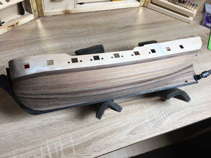 Als nächstes war dann die restliche Außenbeplankung an den Schanzkleidern an der Reihe. Dies war dann schon ein wenig schwieriger, da die Planken an die Stückpforten angepasst werden mussten. Das ein oder andere Mal musste ich hier ein wenig korrigieren, damit alles auch auf dem Millimeter passte.