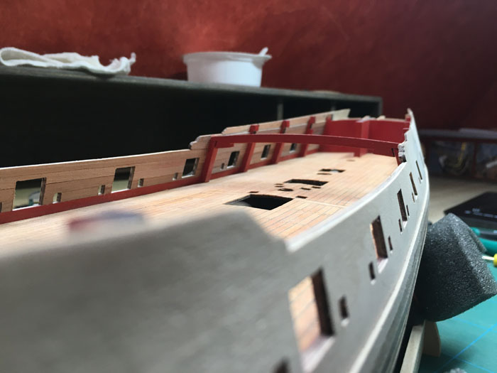 Nachdem dieser Arbeitsschritt erledigt war, konnte ich endlich damit anfangen, die innere Beplankung auf dem Kanonendeck anzubringen. Der Tempelrahmen durfte natürlich auch nicht fehlen, allerdings brachte ich diese nur an den "überdachten" Stückpforten an.