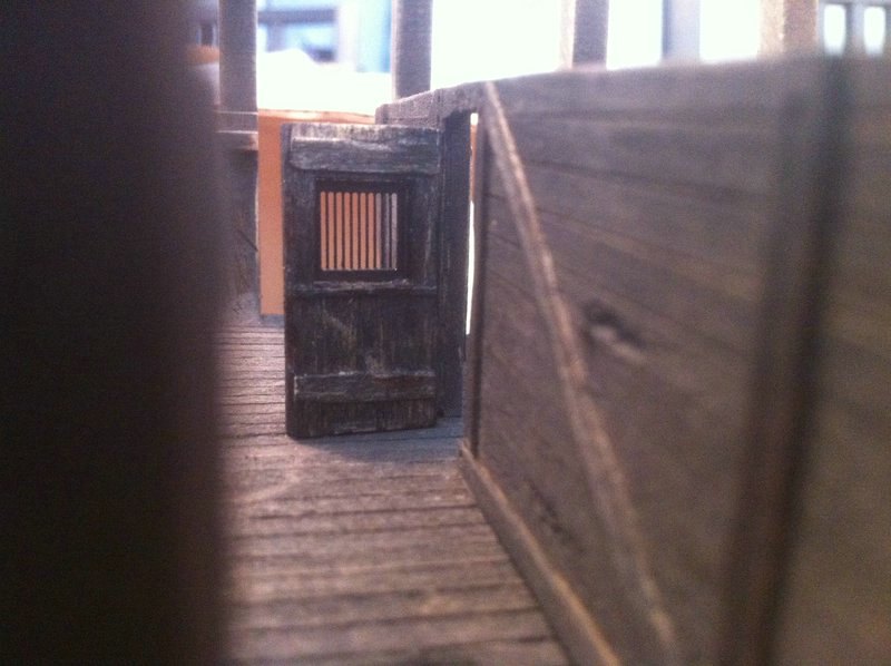 Was aber allerdings noch fehlt, sind die Schaniere an den Türen und die Flaschen im Regal. Zusätzlich erhalten die Türen noch ihren abgenutzten grauen Ton, der aber erst kommt, wenn ich die Zellen fertig habe.Was heute auch noch geschehen wird.