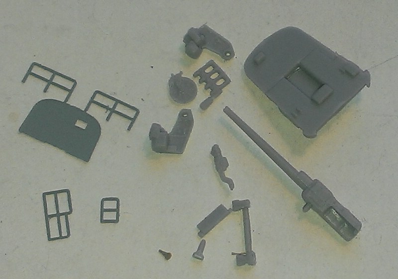 Eine von 16 20mm-Flak. Drei verschiedene Schilde zur Auswahl, aber die richtige Form hat keiner. Der doppellagige von Eduard noch am ehesten, den nehme ich. Das kleine Ätzteil neben den Schilden ist das rein optische Visier, für 1943 die richtige Version.