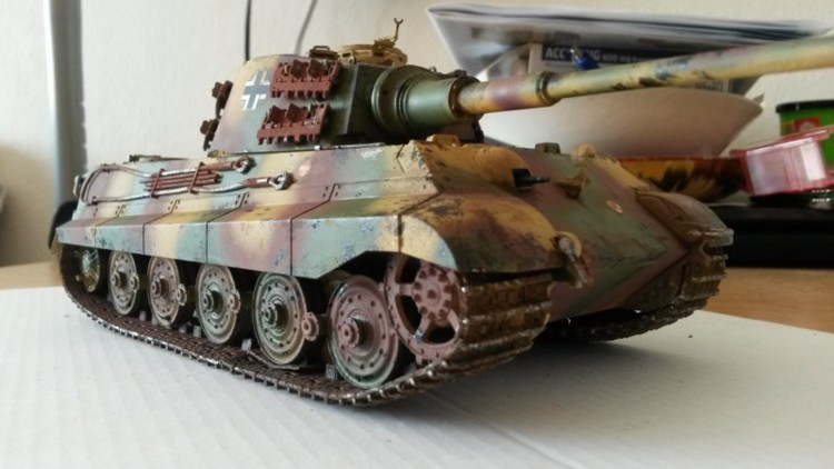 Hier kommt mein zweites Modell das ich jemals gebaut habe... ich hoffe es gefällt. Es handelt sich um den Tiger 2 von Revell. Ein wirklich toller Bausatz ! Leider hatte ich auch hier Probleme mit den Gummiketten - zunächst diese miteinander zu verbinden und dann die Farbe darauf zu befestigen. Diese geht nämlich immer wieder ab... vielleicht habt ihr da Tipps ? Das Weathering habe ich mit dem Weathering-Set von Revell gemacht. Das Camo habe ich mit der Airbrust gemacht - zum ersten mal überhaupt. War sozusagen die Feuertaufe.