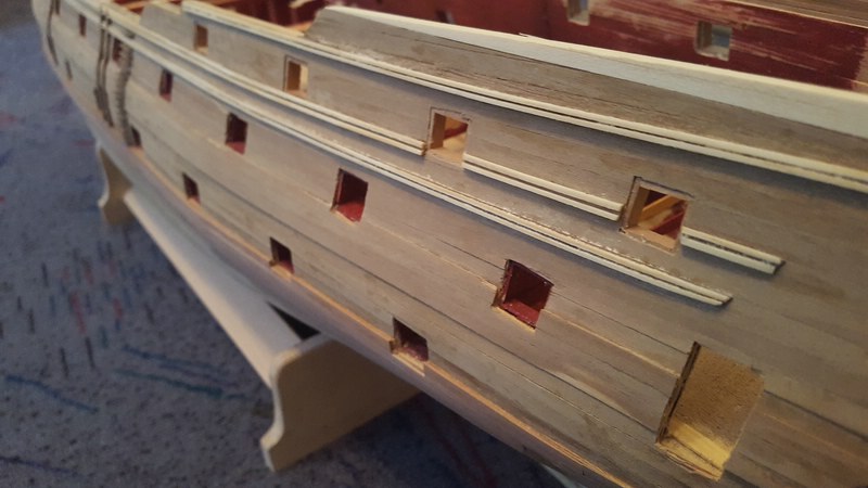 Tja, das kann ich nicht so genau sagen. Wahrscheinlich würden 0,5 mm sogar reichen. Schau dir mal Bordwandfotos der Victory an. Davon gibt es mehr als genug im Internet.Die Fender werde ich dann über die Zierleidsten laufen lassen. Und auch dem unteren Barkholz verpasse ich noch eine zweite Schicht. 0,5 oder gar 1mm drauf?