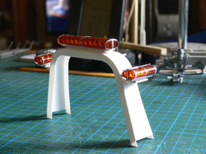 Nun mussten noch zwei Halterungen, für die beiden kleinen Leuchten, angefertigt werden, sie wurden aus 0,5mm Sheet zugeschnitten, mit 0,75mm Sheet, verstärkt und mit je zwei 1mm Bohrungen versehen und am Bügel angeklebt. Zur Verstärkung und für die Optik, wurden noch kleine Dreiecke aus 0,5mm Sheet zugeschnitten und angebracht.