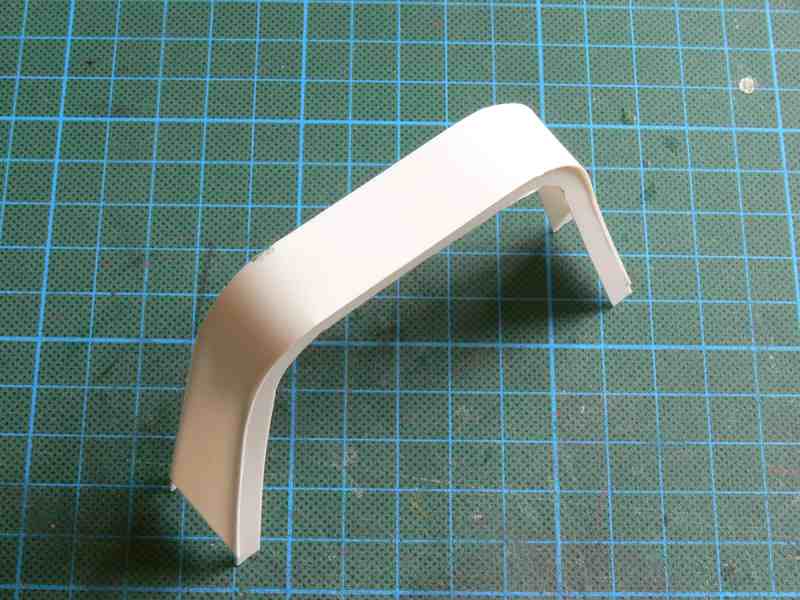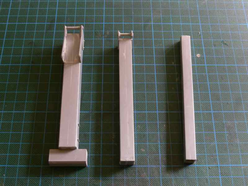Nun hieß es, alles wieder auf „0“ und auf ein neues, dabei wurde dann auch gleich ein weiterer Fehler bereinigt, den ich später bestimmt noch bereut hätte. Die geraden Halterungen, die in der Kabine angebracht werden, wurden überarbeitet und mit einem Winkel versehen, damit sie später besser über die Stoßstange kippen können.