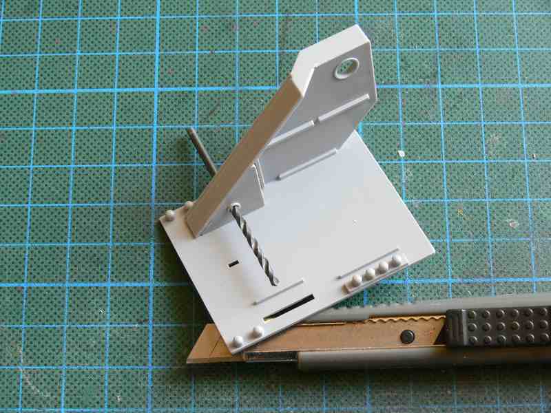 Nun mussten noch zwei Halterungen, für die beiden kleinen Leuchten, angefertigt werden, sie wurden aus 0,5mm Sheet zugeschnitten, mit 0,75mm Sheet, verstärkt und mit je zwei 1mm Bohrungen versehen und am Bügel angeklebt. Zur Verstärkung und für die Optik, wurden noch kleine Dreiecke aus 0,5mm Sheet zugeschnitten und angebracht.