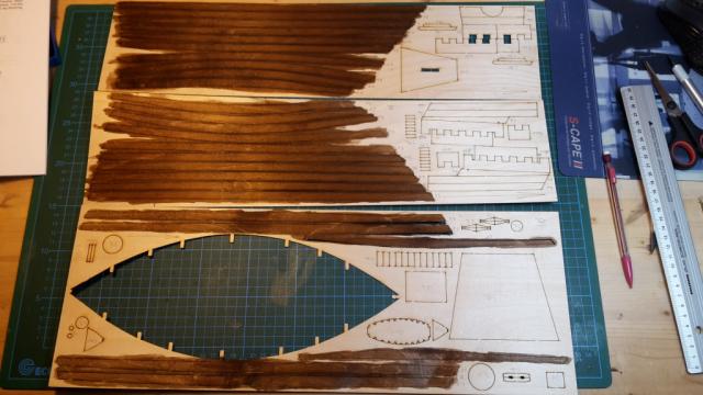 Zur Zeit bin ich dabei die schon vorgelaserten Planken mit dunkler Beize den richtigen dunklebraunen Farbton zu verpassen. Denn wenn die erst einmal angeleimt sind, gibt es dann mit eventuellen Leimflecken beim beizen helle Flecke.