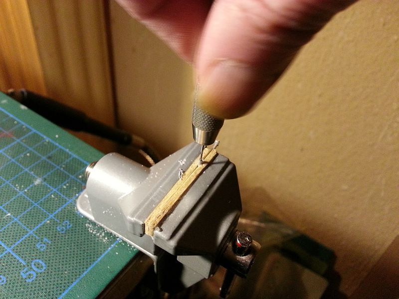 Zum Schluss für gestern Abend, wurden in die Halteplatten, oben und unten, je vier 0,5mm Löcher gebohrt und die Briden eingebaut.