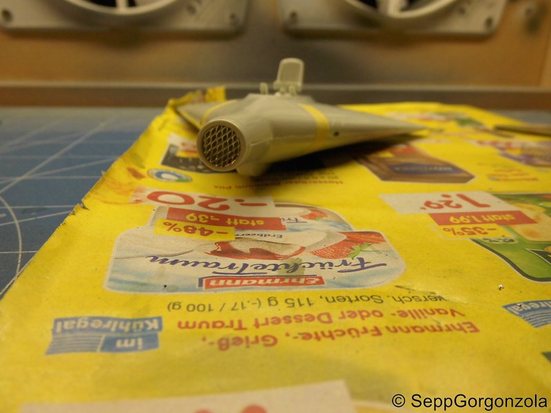 Bug- und Heckgitter sehen super aus. Aber ich würde das Buggitter tiefer im Rumpf unterbringen (als Teil des Triebwerks (siehe V1)). Vielleicht geht ein alter Kuli als Rohr.