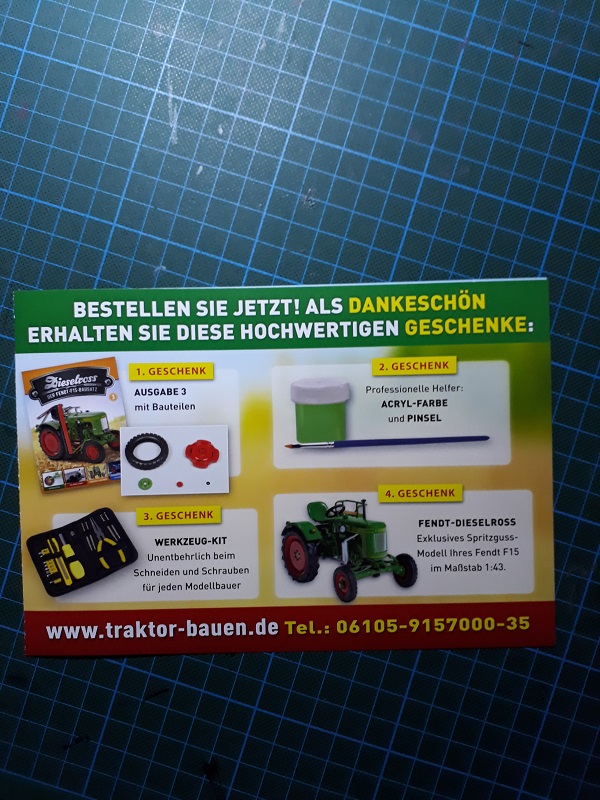 obwohl handwerklich total unbegabt habe ich vor etwa einer Woche den Fendt-Bausatz im Abo bestellt. Einen Tag später fand ich dann im Web