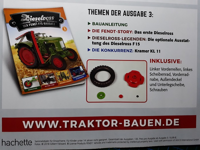und statt den ewigen Grubber, endlich einen schönen Anhänger beigegeben. Die Serie ist auf 130 Ausgaben ausgelegt. Für Abonnenten gibt es einen großen Farbtopf gratis dazu.