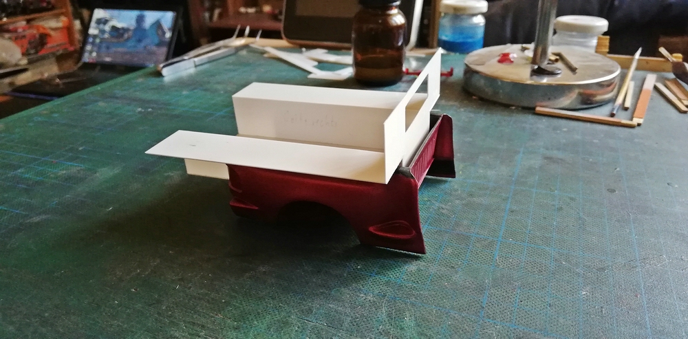 Zwar hat sich das Frontteil, nach dem Verkleben, leicht nach außen gewölbt, aber das ist nicht weiter schlimm. Entweder ich übernehme das in die Form so, oder aber ich ziehe oben noch einen Streifen Sheet ein und verklebe die Oberkante damit.