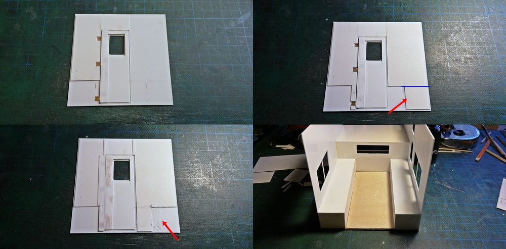 Dann ging es an die Planung der Fensterrahmen, dies wurde so gemacht, das ein kleiner Rand, nach innen, entsteht um da später die Fenster einzukleben. Geschnitten wurden die Rahmen aus 0,3mm Sheet, damit sie nicht zu dick, außen, auftragen.