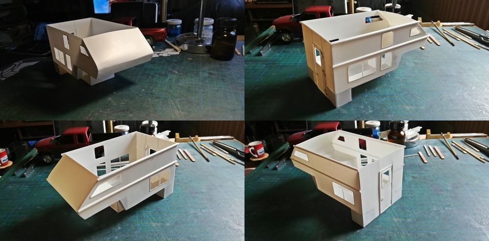Nachdem nun alles geschliffen war, die schwarzen Punkte muss ich zum Glück nicht komplett wegschleifen, wurde vorne noch ein 1,5mm breiter Steg eingeklebt, daran wurde dann das vordere, obere Dachteil angeklebt, damit es gerade ist.