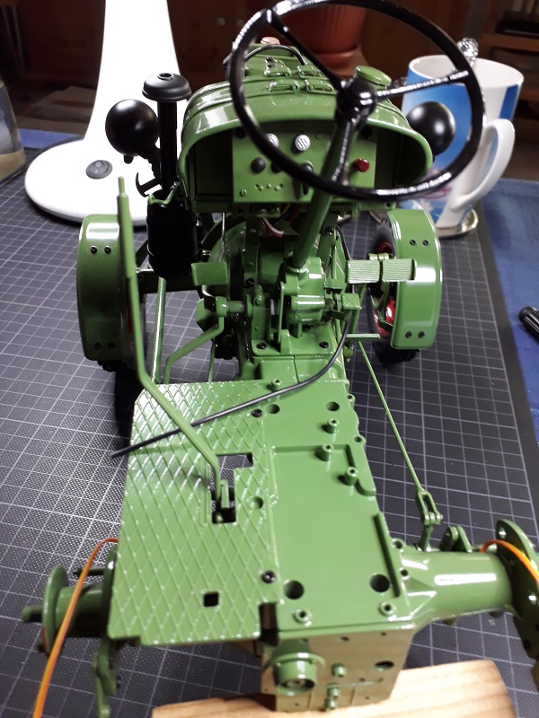 Eine Schraube ist etwas haarig, aber geht schon. Ich muß eh noch mal an die Lenkung ran. Sie ist mir zu wackelig. Auch die beiden Vorderräder und deren Halterung müssen nochmal über