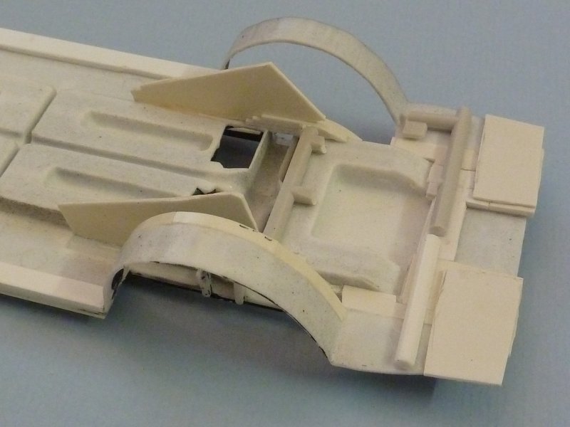 Zu den bisherigen "Einbauten" kamen dann noch aus Plastik-Sheet 1mm die seitlichen Teile ran, die ich dann verspachtelte.