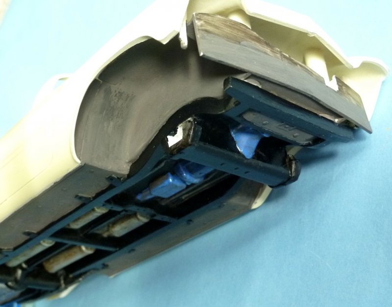 Die hinteren Kotflügel sollte man durch ein Keilstück das man hinten einklebt etwas auseinanderspreitzen, damit die hintere Stoßstange realistischer anliegt.